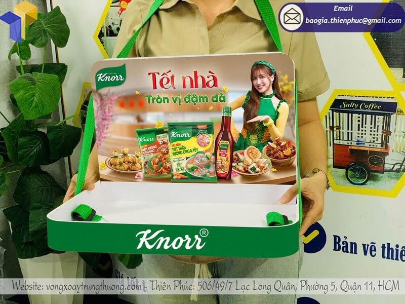 Nhờ thiết kế gọn nhẹ, khay đeo sampling cho phép nhân viên chủ động di chuyển giữa các quầy kệ, tiếp cận đúng đối tượng khách hàng mà không làm gián đoạn luồng di chuyển chung trong siêu thị.