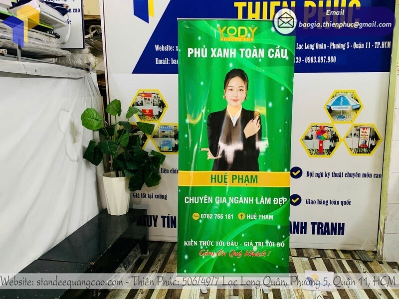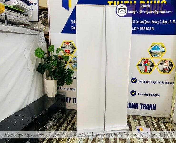 Khung standee được làm từ nhôm chống gỉ, phần chân được thiết kế mở rộng hoặc dạng bản lớn giúp giữ thăng bằng ngay cả ở khu vực đông người qua lại.
