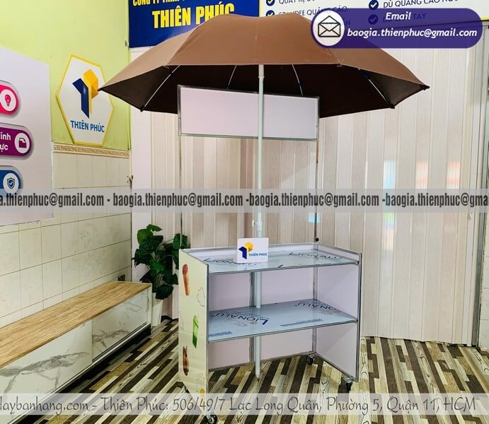 Phần dù che có thể in logo, màu nhận diện hoặc thông điệp chiến dịch, giúp quầy nổi bật hơn và tạo cảm giác chuyên nghiệp.
