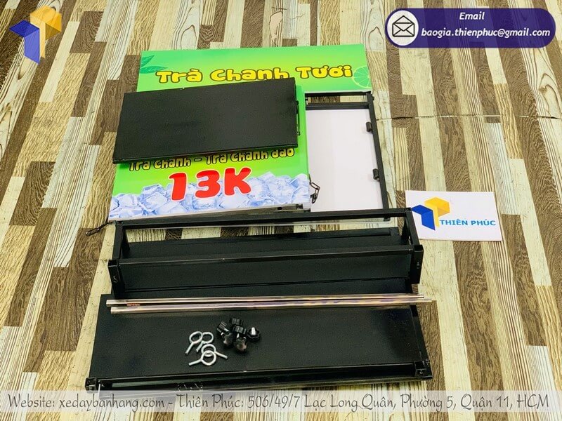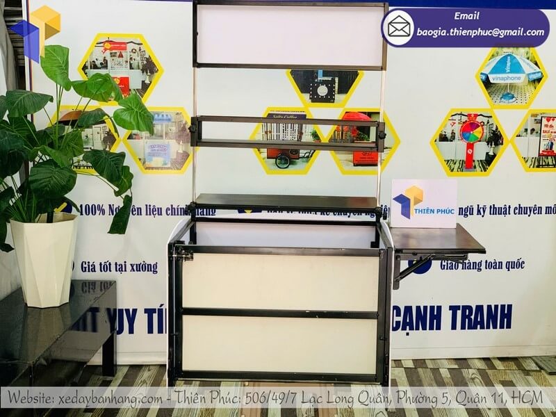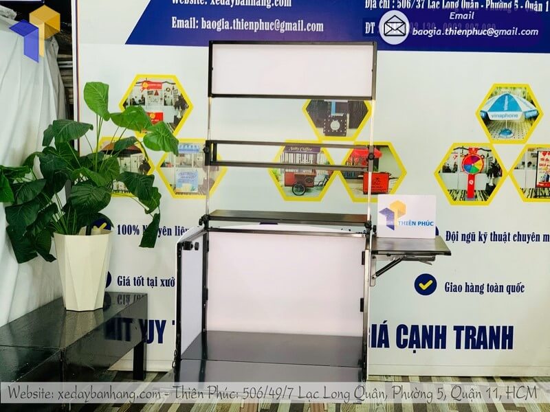 Thùng bán nước được làm từ khung sắt chống gỉ cao cấp, đảm bảo độ bền và an toàn vệ sinh thực phẩm. Bề mặt nhẵn, dễ lau chùi, hạn chế bám mùi, giúp người kinh doanh luôn giữ được sự sạch sẽ, chuyên nghiệp trong mắt khách hàng. Đây chính là yếu tố tạo niềm tin cho khách khi lựa chọn bán trà chanh di động.