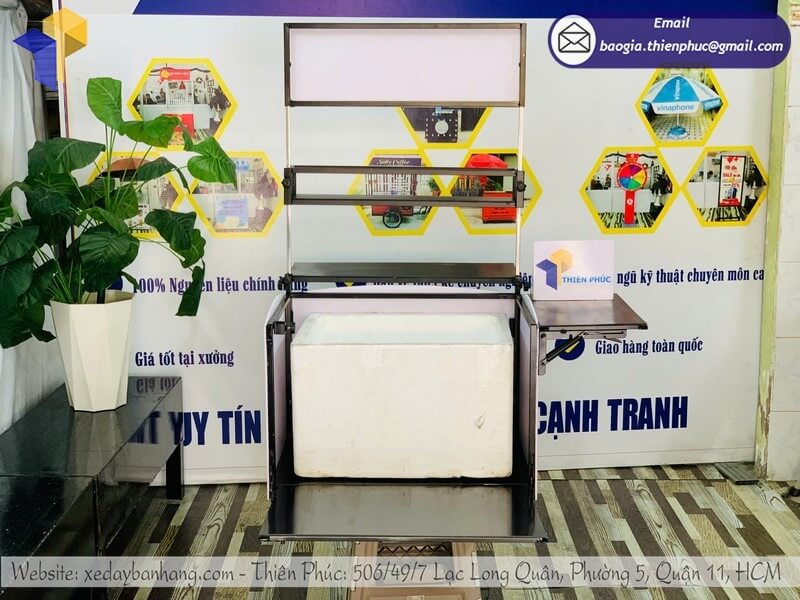 Thùng được thiết kế khoa học, có ngăn chứa đá, nguyên liệu và khu vực pha chế gọn gàng. Điều này giúp người bán dễ thao tác và phục vụ khách nhanh chóng, nâng cao trải nghiệm mua hàng khi triển khai mô hình bán trà chanh di động.