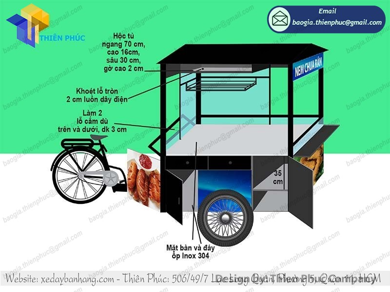 Bên cạnh đó, Thiên Phúc còn nhận thiết kế đóng xe đạp bán hàng theo yêu cầu, đảm bảo tiêu chí ĐẸP – TIỆN ÍCH – CHẤT LƯỢNG – GIÁ RẺ. Ngoài ra, Thiên Phúc còn góp ý với khách hàng thiết kế đề can theo yêu cầu, thiết kế xe bán hàng TÀI LỘC, hợp mệnh, hợp tuổi